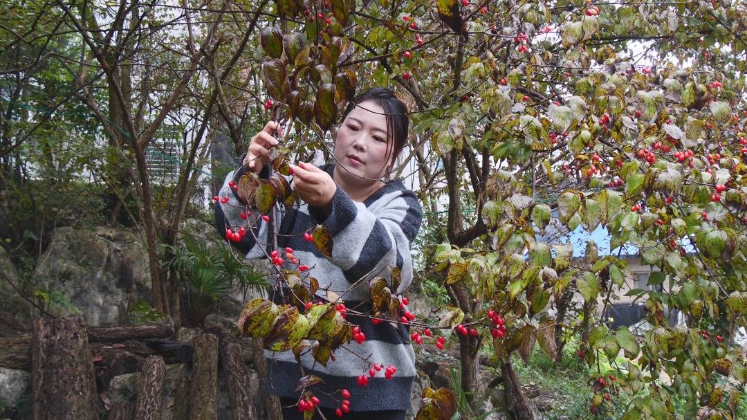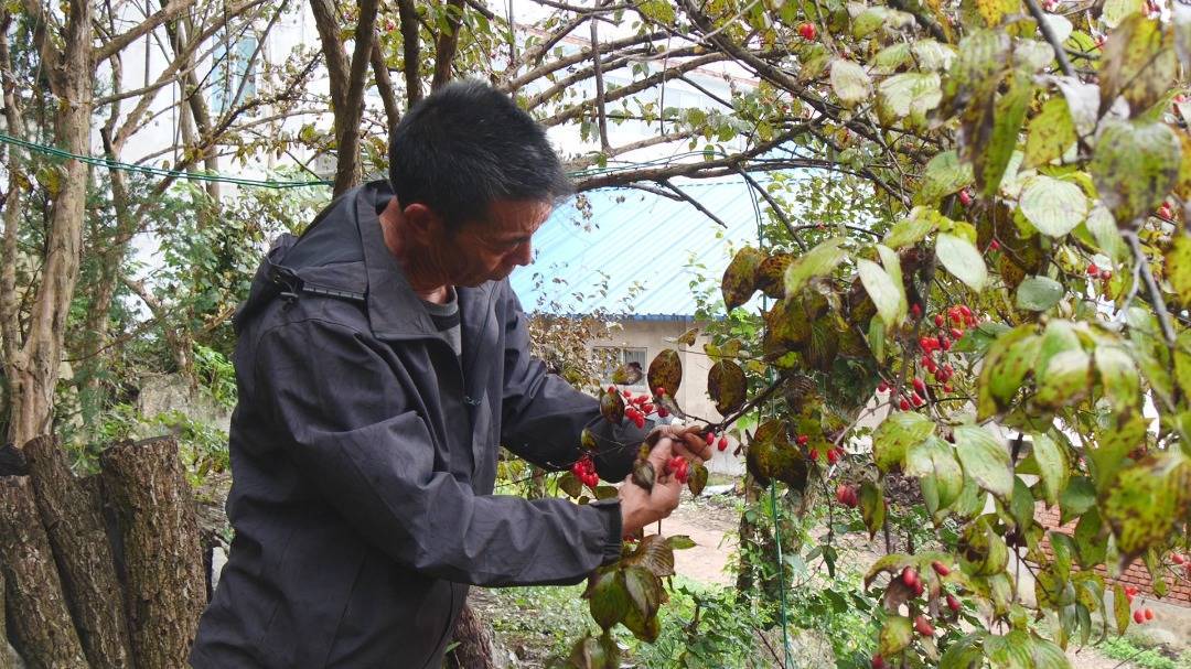 在闫华平家的房前屋后、坡地田间,一棵棵山茱萸树上果实累累,红果压枝、圆润晶莹。闫华平正细心采摘,将成熟的山茱萸放入篮中。